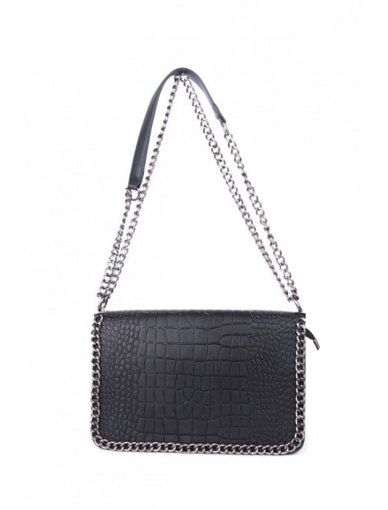 Axelväska i skinnimitation och silverkedjor. Väskans ovandel stängs med spänne. Inuti försluts väskan samt fack med dragkedja. Finns i färgerna: Svart &