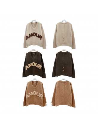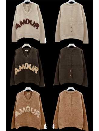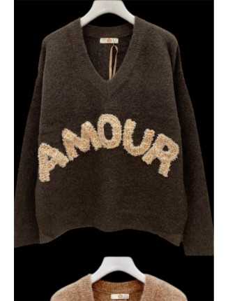 - Den har texten "AMOUR" broderad på framsidan med ett fluffigt, ljust garn.