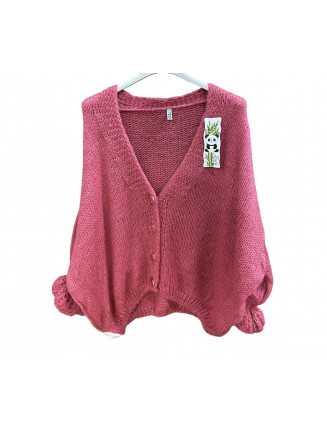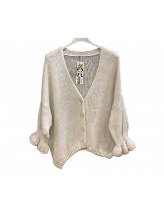 lös stickad kofta i en naturvit eller beige färg, med knappar framtill och volangdetaljer på ärmsluten. - Stil: Lös passform (oversize fit) med V-ringning och knappar.