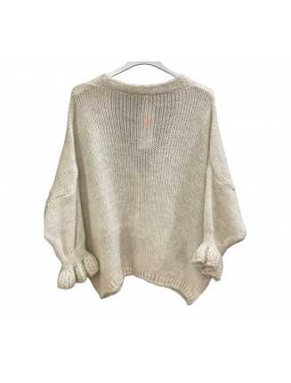 lös stickad kofta i en naturvit eller beige färg, med knappar framtill och volangdetaljer på ärmsluten. - Stil: Lös passform (oversize fit) med V-ringning och knappar.