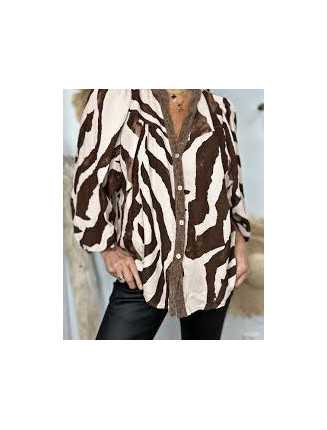 - Design: Blusen har ett abstrakt zebratryck i brunt och beige, en ståkrage med knäppning, och mjukt rynkade detaljer vid halsringningen och muddarna. Den har långa ärmar med knäppta manschetter och en avslappnad passform. Spets detaljer på ryggen och runt om halsen