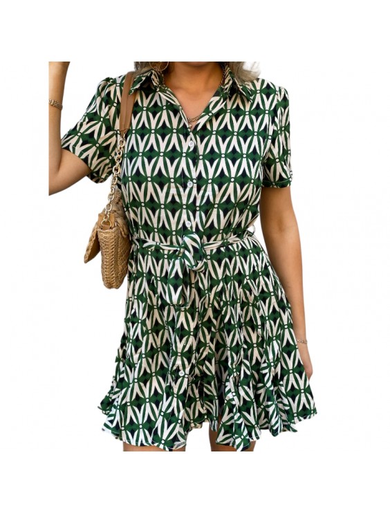 Krage: krageFörslutning: KnappMönster: BatikDetaljer: Med skärp, underklänningSkötselråd: 30 °C maskintvätt, skontvättVår modell: Modellen är 170 cm lång och har på sig storlek SPassform: Regular FitSnitt: FittedLängd: KortÄrm: Kort ärmMaterial: 100% polyesterTyg: Satin