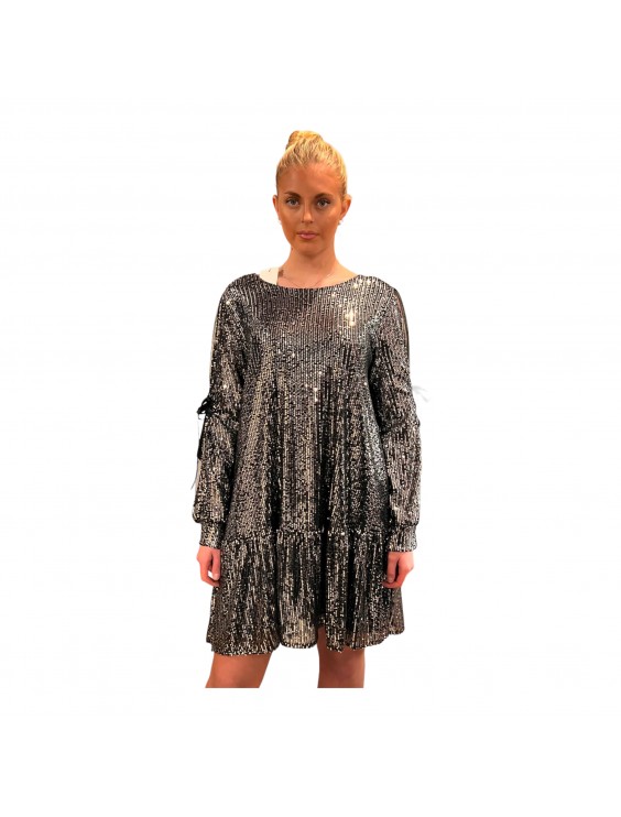 Klänningen är skuren under knäet med lite längre bak än fram. Det finns en liten stativkrage, t-ärmar och bred svans.det är spets på ärmen !Poppar i ryggen för att stänga.
