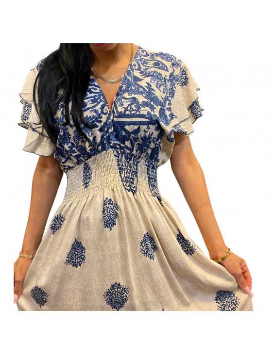 • Denna eleganta klänning kombinerar stil och komfort med sin smickrande V-ringning och korta volangärmar. Den smockade midjan framhäver figuren på ett vackert sätt, medan den långa kjolen med mörkblå detaljer skapar en sofistikerad look. Det unika mönstret ger en modern och samtidigt klassisk känsla, perfekt för både vardag och fest. Ett tidlöst plagg som blir en självklar favorit i garderoben!