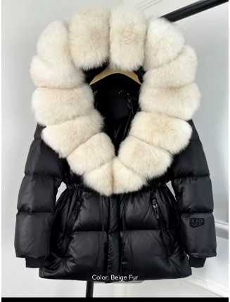 dunjacka med justerbart och avtagbart band i midjan med rymlig luva samt avtagbar päls.