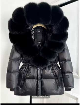 dunjacka med justerbart och avtagbart band i midjan med rymlig luva samt avtagbar päls.