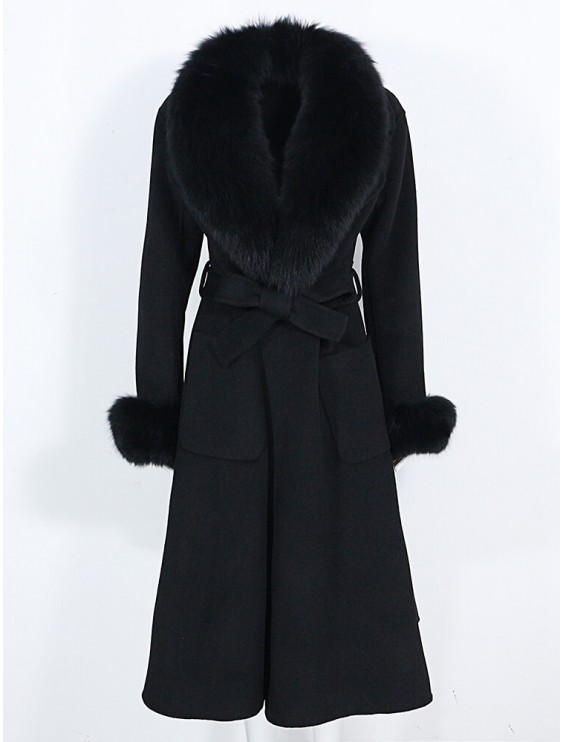 Underbar och fint kappa från Vivanilla made in Italy I cashmere och ull-blandning som är lätt klockad och har en fin längd på ca 90cm. En stor mysig pälskrage pryder skärningen framtill. Kappan är en ultimat vår och höstkappa. Ett band knyts i midjan för att ge en snygg form.Normal i storleken.