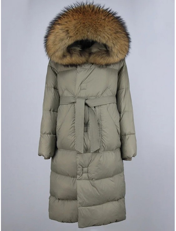Varm dunjacka i längre modell. Äkta pälskrage. Bälte i midjan för en figurskydd form.