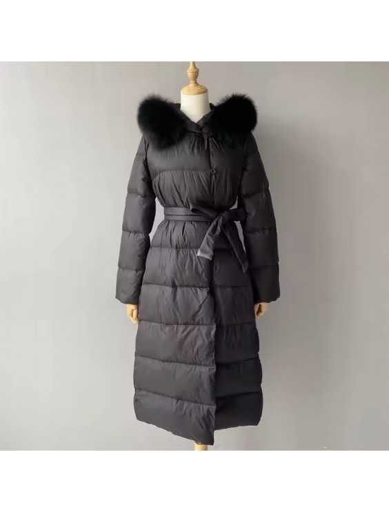 Varm dunjacka i längre modell. Äkta päls. Bälte i midjan för en figurskydd form.