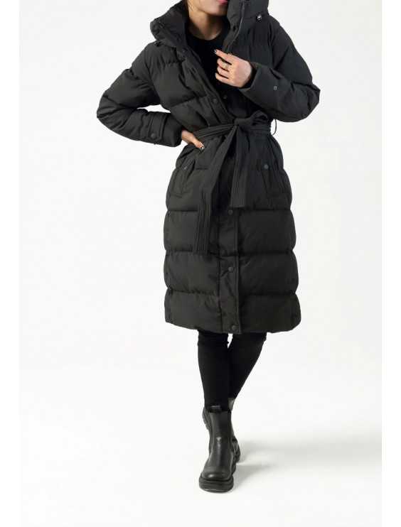 Mellanlång dunjacka i quiltat tyg. Huvmodell med justerbar dragsko och blockdragsko. Stå upp rak krage toppad med hakskydd. Långa ärmar med infällda ärmhål. Muddar avslutade med ribb. Muddar dekorerade med knappflikar. Tillpassad skärning. Dragkedja och skyddsflik med tryckknappar framtill. Raglanfickor med pipett och tryckknappar på sidorna. Avtagbart skärp med ribbstickning för att knytas i midjan. Fodrad inuti. Modellen är 174 cm lång.