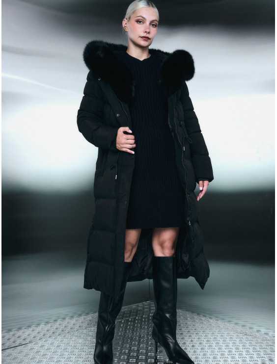 dunjacka i quiltat tyg med fuskpälsinlägg. Huvmodell, kantklädd med fuskpäls helt framtill, justerbar med elastiska knappar. Långa ärmar med infällda ärmhål. Dragkedja dold under päls framtill. Avtagbart bälte med ribbeffektsömmar, perforerat med dubbar och justerbart med spänne. Slimmad passform, nära kroppen. Raglanpassade fickor med tryckknappar. Färdig med integrerade, ej avtagbara fuskpälsinlägg på ärmslut och bas. Fodrad inuti. Modellen är 176 cm lång, bär storlek S.