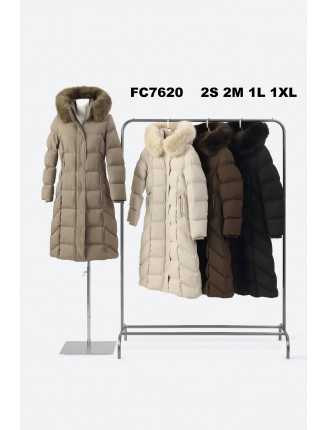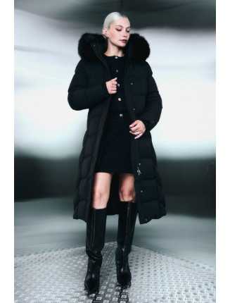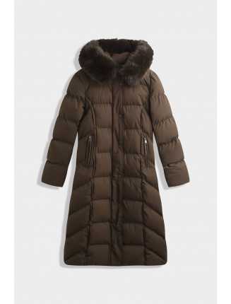 Lång dunjacka med avtagbar pälsfodrad huva. Långa ärmar, ribbade ärmslut. Dragsko i justerbar midja. Raglanfickor med kant. Dragkedja med tryckknapp framtill. Pressade sidoslitsar.