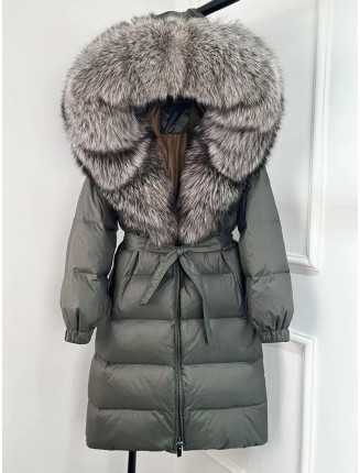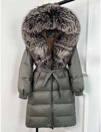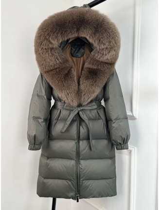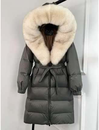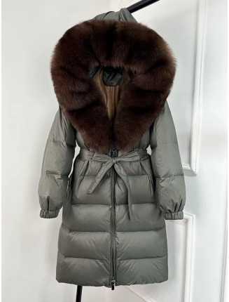 dunjacka med justerbart och avtagbart band i midjan med rymlig luva samt avtagbar päls