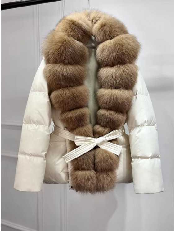dunjacka med justerbart och avtagbart band i midjan med rymlig luva samt avtagbar päls