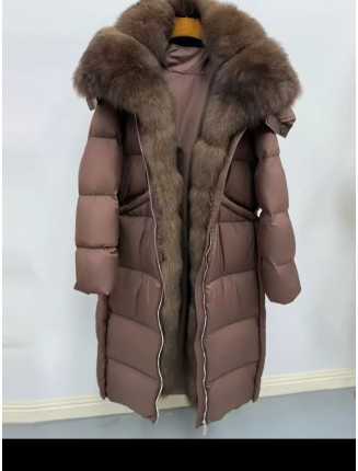 dunjacka med justerbart och avtagbart band i midjan med rymlig luva samt avtagbar päls.