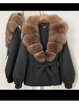 dunjacka med justerbart och avtagbart band i midjan med rymlig luva samt avtagbar päls