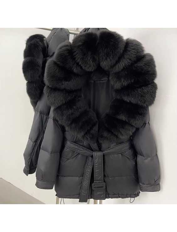 dunjacka med justerbart och avtagbart band i midjan med rymlig luva samt avtagbar päls