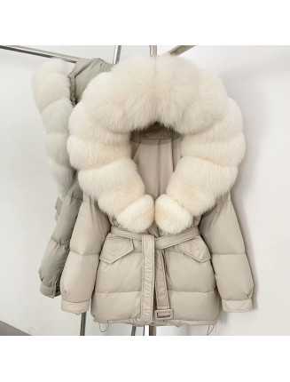 dunjacka med justerbart och avtagbart band i midjan med rymlig luva samt avtagbar päls