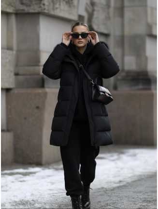 Vinterjacka med päls. Bälte för mer figursydd look. Huva.