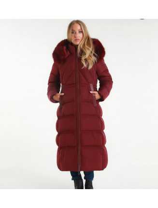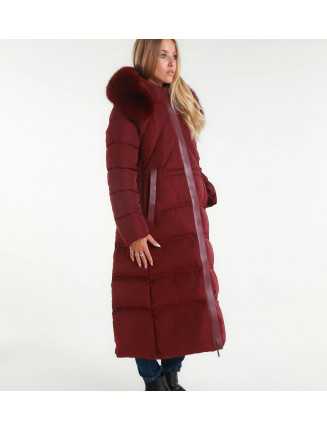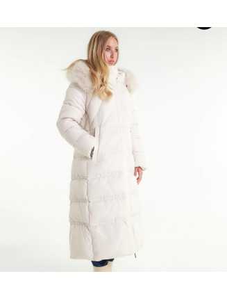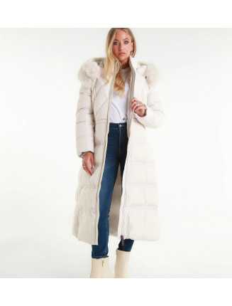 Lång vadderad kappa med feminin linje, med blandad quiltning (diagonal på bysten och horisontell nedtill) som förlänger figuren. Huvan är avslutad med en mjuk och voluminös fuskpälskant, perfekt för att ge en elegant touch till vinterlooken.