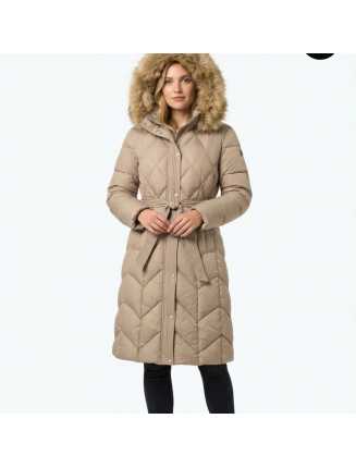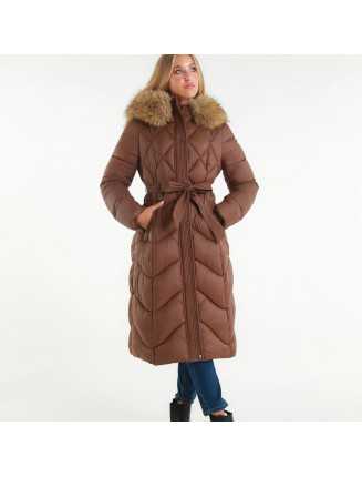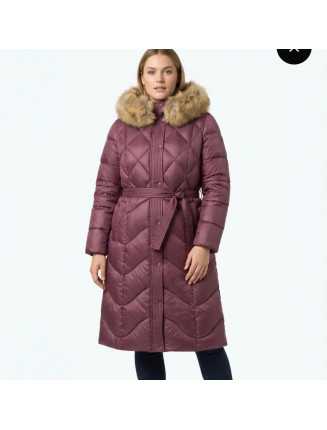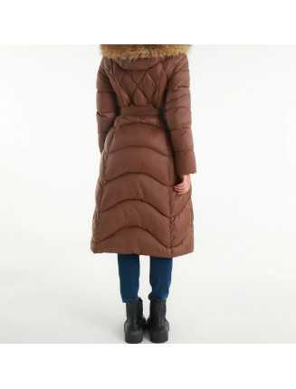 Lång vadderad kappa med feminin linje, med blandad quiltning (diagonal på bysten och horisontell nedtill) som förlänger figuren. Huvan är avslutad med en mjuk och voluminös fuskpälskant, perfekt för att ge en elegant touch till vinterlooken.