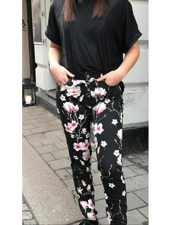 Snygga byxor med blommprint.Färg:svartStorlek: XS/34- XL/42 , Normal i storlek med stretch.Tvättråd: HandtvättMaterial: 97% Bomull, 3% Elastane