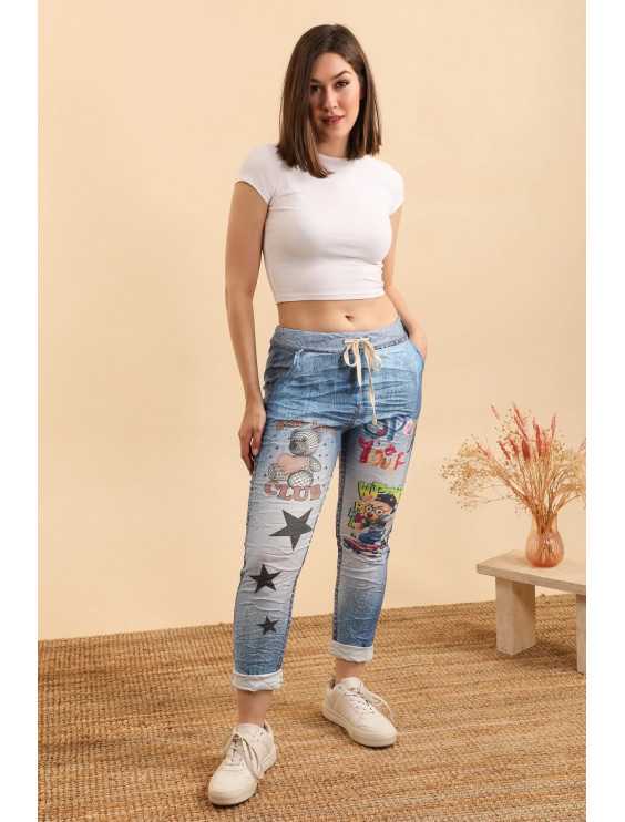 The pants-jogg printed with a cut that could suit a lot of morphology, and very extensible. The pants are length 100 cm and a pool tower 100cm The pants can adapt by a size 36 - 44, it adapts to each morphology. The cutting of this pants exist in many other pattern available in our catalog under the reference #80PB0P009