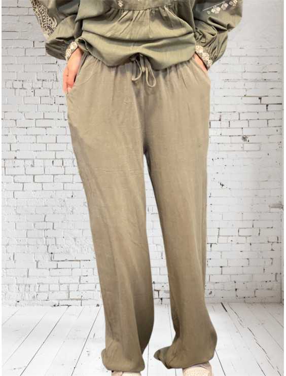 Ett par byxor i luftig, vävd linblandning med låg midja och avslappnad passform. Byxorna har klädd resår och dragsko i midjan, sidfickor och raka ben fån voyles
