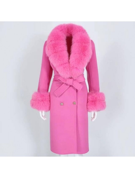 Vivanilla Underbar längre kappa i ull och cashmere som är en perfekt vår/höst och vinterkappa. Kappan stängs med knappar framtill samt ett band som knyts i midjan som ger en fin form. Jackan har en stor fluffig rävpälskrage kring skärningen. Normal i storleken. Avtagbara rävpäls-muddar på ärmsluten.
