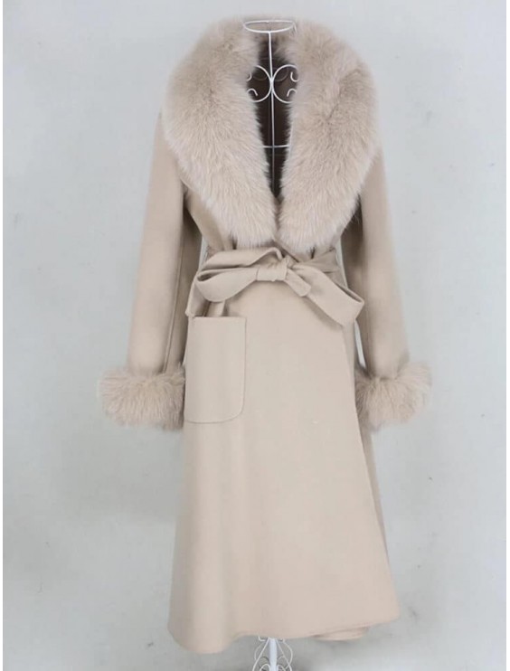 Underbar Vivanilla längre kappa i ull och cashmere som är en perfekt till vår/höst och vinterkappa. Kappan stängs med knappar framtill samt ett band som knyts i midjan som ger en fin form. Jackan har en stor fluffig rävpälskrage kring skärningen. Normal i storleken. Avtagbara rävpäls-muddar på ärmsluten.tvättråd:kemtvätt
