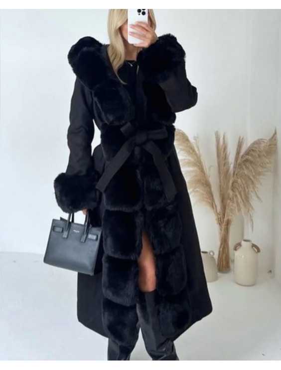 Lång kappa med kashmirtouch. Modell med luva och krage. Avtagbar fuskpälsinsats runt huvan och framsidan genomgående. Långa ärmar med infällda ärmhål. Manschetter täckta av avtagbar fuskpäls. Klipp Avtagbart bälte att knyta. Raglanfickor med pipett på sidorna. Foder inuti med quiltat tyg. Modellen är 176 cm lång.