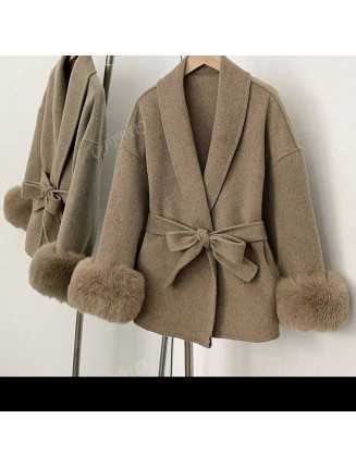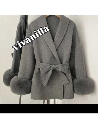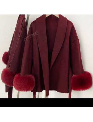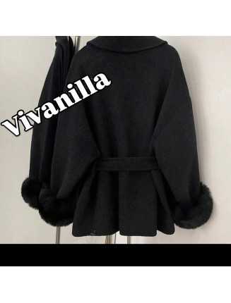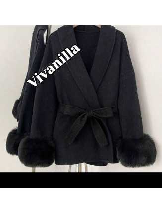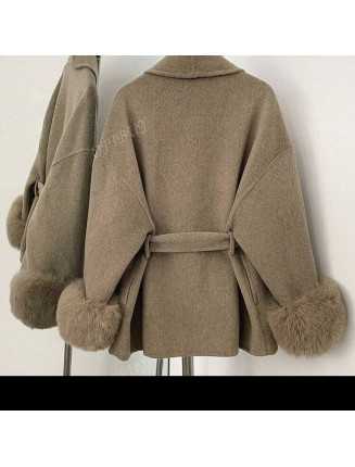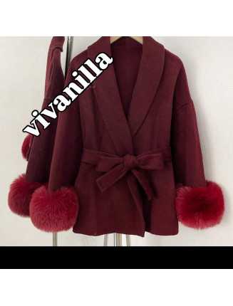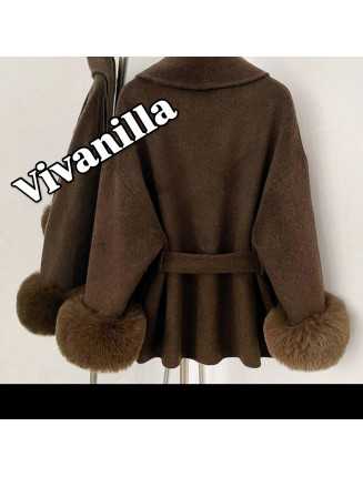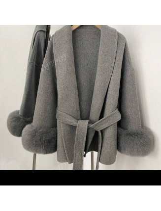 Fantastisk fin lång kappa med äkta päls detalj. Avtagbart bälte i midjan. Fickor i sidan.  90% ull och 10% cashmere.