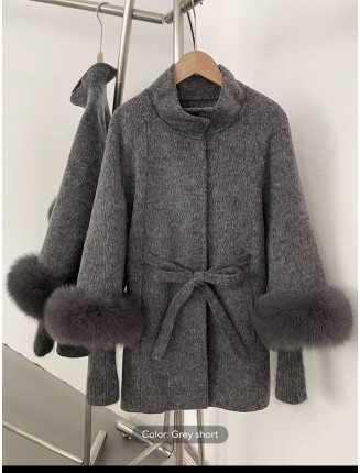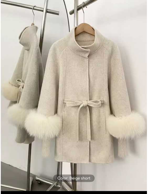 Fantastisk fin lång kappa med äkta päls detalj. Avtagbart bälte i midjan. Fickor i sidan.  90% ull och 10% cashmere.