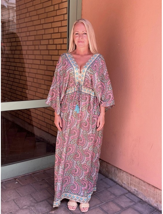 Lång klänning med djup V-ringning. Modellen på bilden är 177 cm lång och bär storlek one size. Längden är lång och ärmlängden är trekvarts lång. Passformen är regular fit. Halsringningen är djupringad/ V-ringad. Beskrivningen är mönstrad. Skötselråd:Maskintvätt 30 graderStrykning sker på låg temperaturTål kemtvätt Hängtorkas