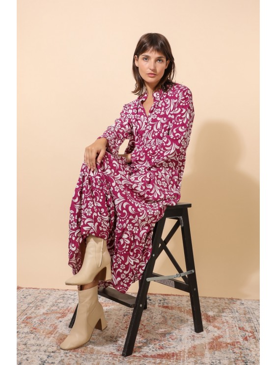 Supersnygg mönstrad långklänning med snygg detalj vid V-rigningen Klänningen har fint form och långärmade .nyaste modell från Italien  .lång modell och fina mönsterModellen är 170cm lång.Färg: röd.grön.blåStorlek: Onesize, passar XS-XL Tvättråd: 30 graderMaterial: 100% Viscos