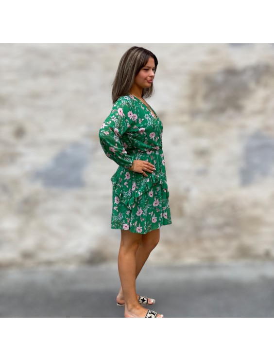 Super fin klänning med resår i midjan . Klänningen har en omlott v-ringning. Modellen är 161cm lång och bär storlek S.Färg: Grön/RosaStorlek: XS-XLTvättråd: 30 graderMaterial: 97% Polyester, 3% Elastane
