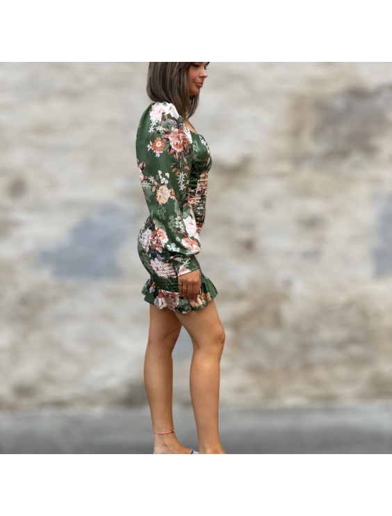 Grönblommig miniklänning med puffärm