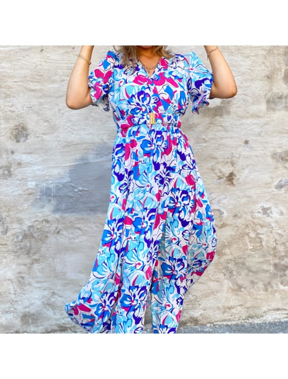 V-ringad klänning. Modellen på bilden är 170 cm lång och bär storlek one size. Passformen är regular fit och halsringningen är V-ringad/ djupringad. Beskrivningen är mönstrad. Skötselråd:Kan maskintvättas i 30 graderHängtorkasEj kemtvättas Strykning sker på låg värme