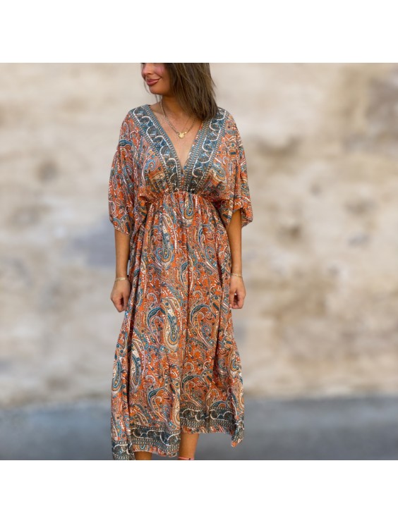 En ankellång klänning i vävd kvalitet av just viskosblandning. Klänningen har V-ringning och v skuren öppning fram. Modellen på bilden är 170 cm lång och bär storlek one size. Längden är lång och ärmlängden är kort ärm. Beskrivningen är mönstrad. Skötselråd:Kan maskintvättas i 30 grader HängtorkasStrykning sker på låg temperatur