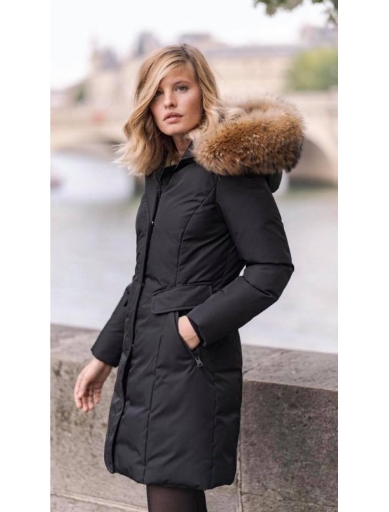 Snygg figursydd dunjacka 80 % POLYSTER 20 % FJÄDER. löstagbar Pälskrage i 100% ÄKTA RECON . Vattenavvisande och vindtät. Tvättråd: Kemtvätt.