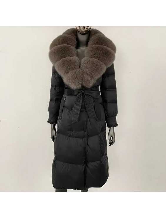 Lång dunjacka med justerbart och avtagbart band i midjan med rymlig luva samt avtagbar päls