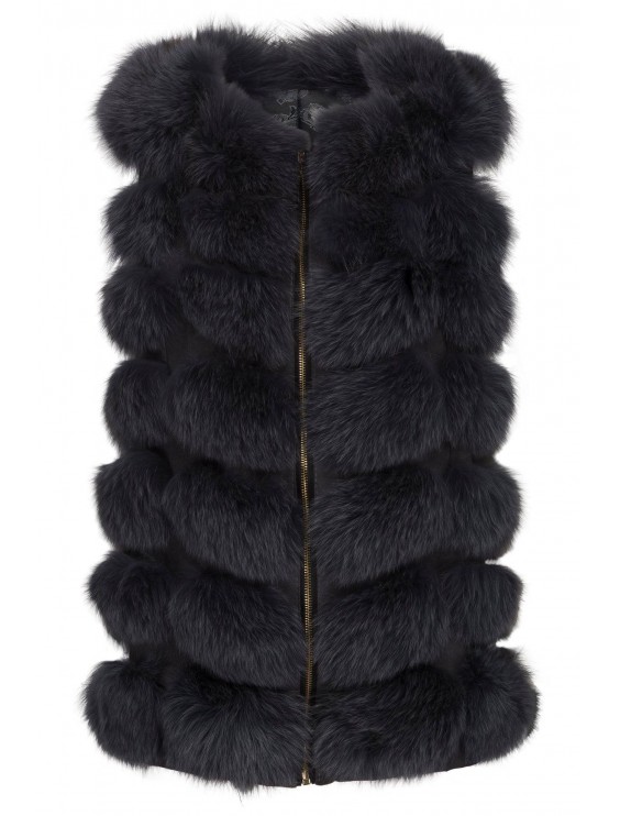Exklusiv pälsväst med fickor. Foder i satinliknande material. Knäpps framtill med hyskor och hakar. Tillverkad av: 100% Räv. Innerfoder: 100% Polyester. Finns i färgerna: svart-ljusgrå-mörkgrå-mörkgrönLängd: 65 cm från nacken. Storleksråd: Normal. Tvättråd: Lämnas till pälsspecialist.