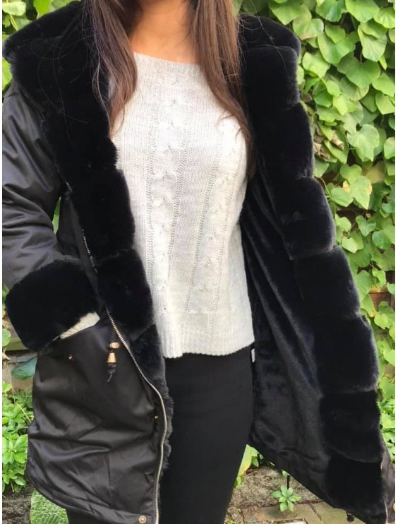 Parkas vinterjacka lång pälskrage svart grön. Längre jacka i en parkasmodell som ser otroligt lyxig ut på. Jackan har ett mjukt mysigt avtagbart foder inuti. En stor pälskrage är fäst på luvan som även den är avtagbar. Pälsdetaljer framtill vid ärmsluten samt framtill. Stängs med dragkedja.100% softpäls akryl