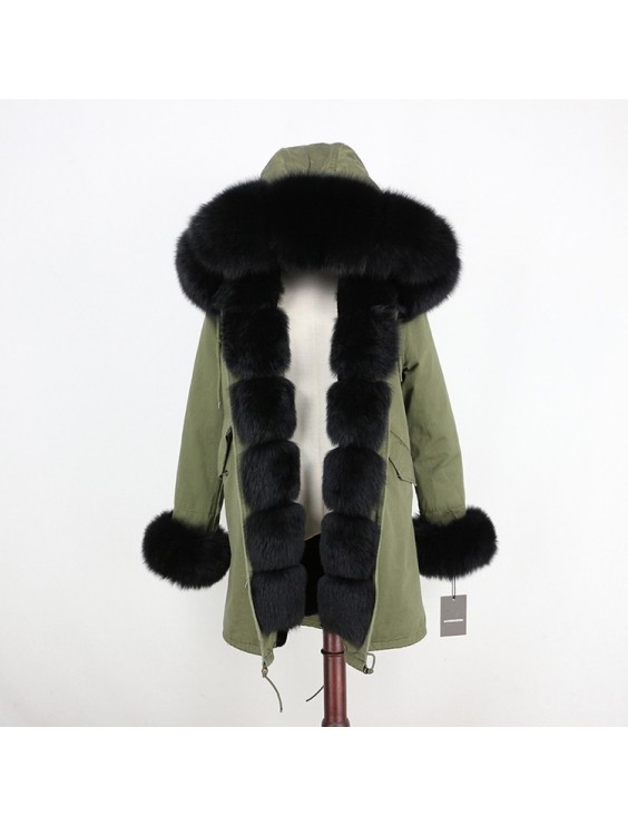 Parkas vinterjacka lång pälskrage grön . Längre jacka i en parkasmodell som ser otroligt lyxig ut på. Jackan har ett mjukt mysigt avtagbart foder inuti. En stor pälskrage är fäst på luvan som även den är avtagbar. Pälsdetaljer framtill vid ärmsluten samt framtill. Stängs med dragkedja.100% Rävpäls