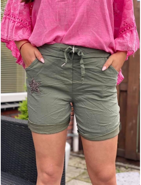 Snygga shorts med stjärna vid sidan Är i stretchigt jeanstyg.Färg: militär grönTvättråd: 30 graderMaterial: 97% Bomull, 3% Elastane