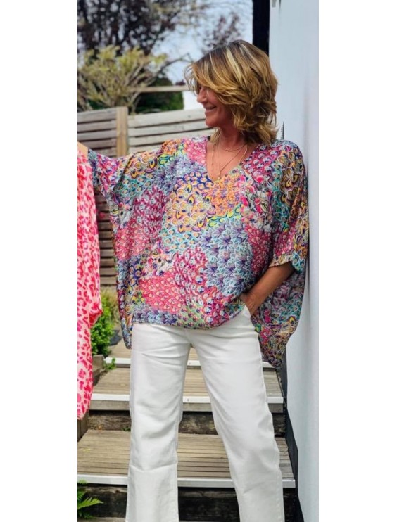 Häftig mönstrade silke tunika ! Är mjukt, glansigt tyg. . Färg: rosa Material: 95% Polyester, 5% Elastan Tvättråd: 30 grader Storlek: Onesize, passar uppskattningsvis XS/34 - XL/42.