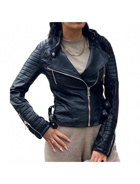 Jackor i punkstil för kvinnor i konstläder, knytskärp, motorcykel, kort kappa, långa ärmar, dragkedja, ytterkläder, bomber,