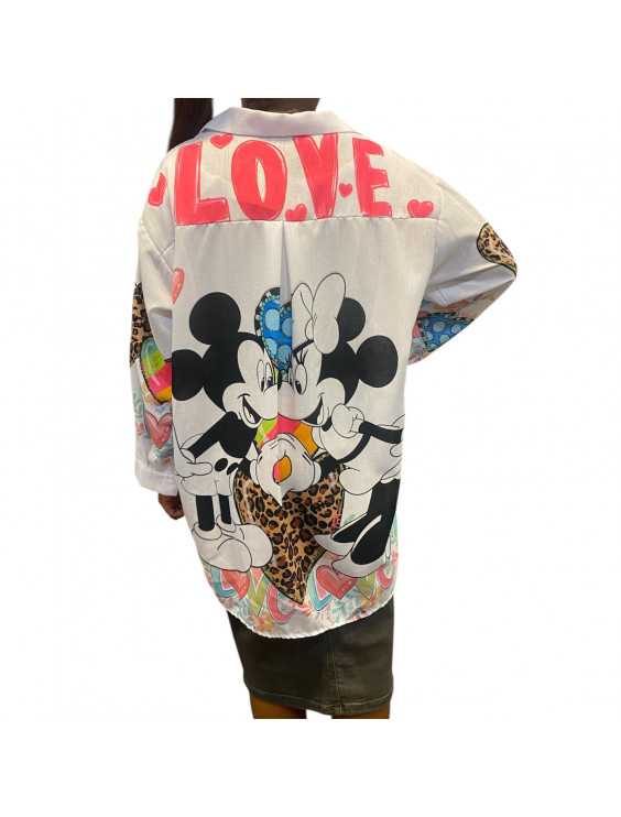 Vit oversized skjorta med färgglatt tryck av Musse och Mimmi Pigg, leopardmönstrade detaljer och stora hjärtan. Skjortan har långa ärmar, knappar framtill och coola blom- och textdetaljer. Perfekt för dig som gillar statement-plagg och lekfull stil