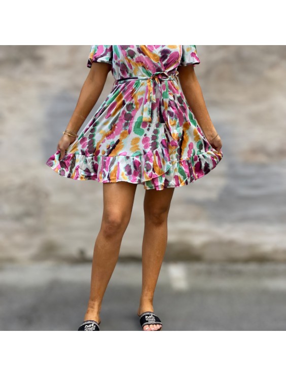 Den här klänningen har en livfull och lekfull design med ett färgstarkt mönster i rosa, grönt, gult och vitt. Den kortärmade modellen och V-ringningen skapar en feminin och luftig känsla, medan det knytbara midjebandet framhäver figuren på ett smickrande sätt. Volangdetaljerna längs nederkanten ger extra rörelse och elegans, vilket gör klänningen perfekt för soliga dagar och festliga tillfällen.