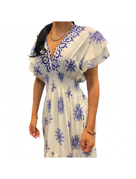klänningen är en stilren och somrig outfit som kombinerar komfort med elegans. Den är tillverkad i ett lätt tyg, troligtvis bomull, vilket gör den perfekt för varma dagar. Klänningen har korta, fladdrande ärmar, en smockad midja och en V-ringning som ger en feminin och avslappnad silhuett. Det blå blommiga och geometriska mönstret skapar en harmonisk och intressant design, särskilt kring halsringningen och fållen.
